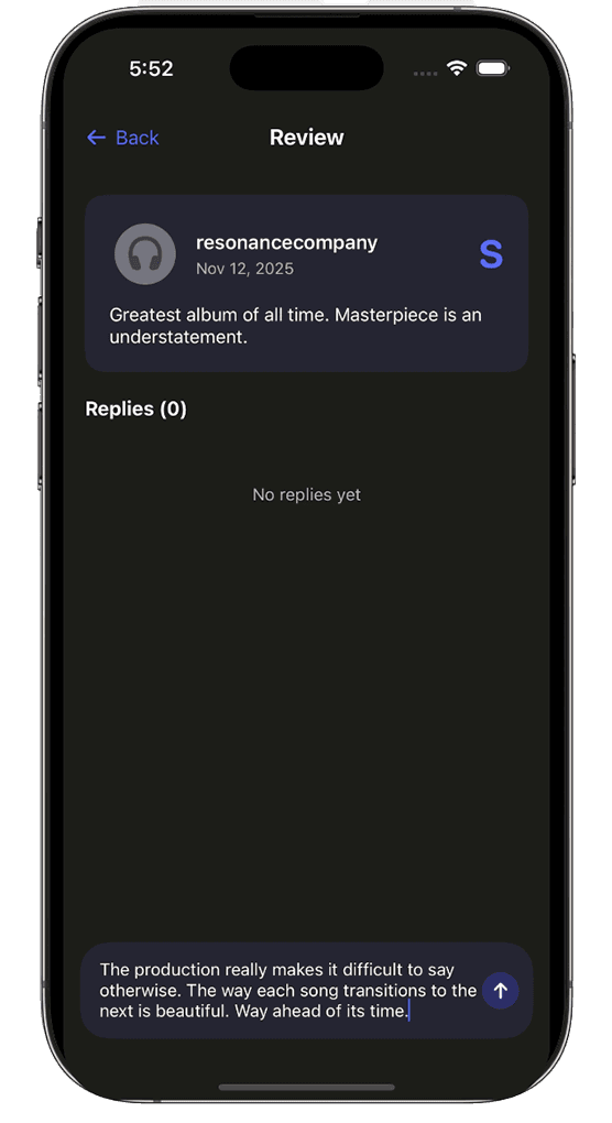 Check out other user reviews on any album. Users can reply to any review to have conversations about music.