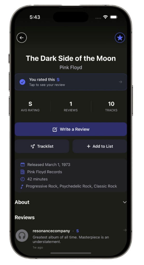 Keep track of all your albums you’ve listened to on your profile. Get personalized stats updated after each logged review.